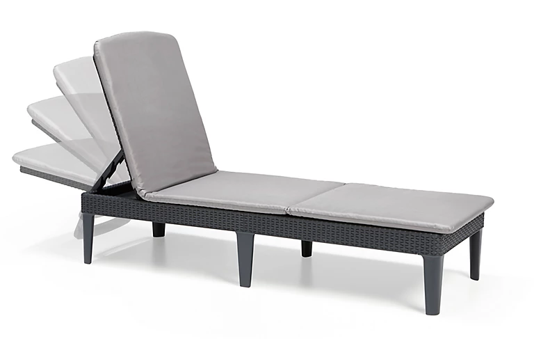 Bain de soleil 4 positions Jaipur gris graphite en résine de synthèse injectée (polypropylène – Caco3) imitation rotin tressé‚ vendu avec coussin gris en polycoton. A monter soi-même. Dimensions 187x58x29 cm.