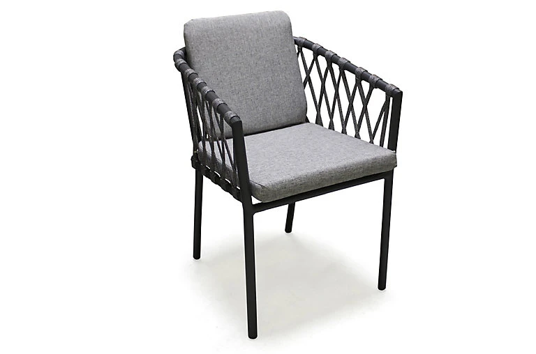 Le fauteuil de jardin empilable PILAT en aluminium gris anthracite et corde est confortable grâce à ses 2 épais coussins déhoussables gris.